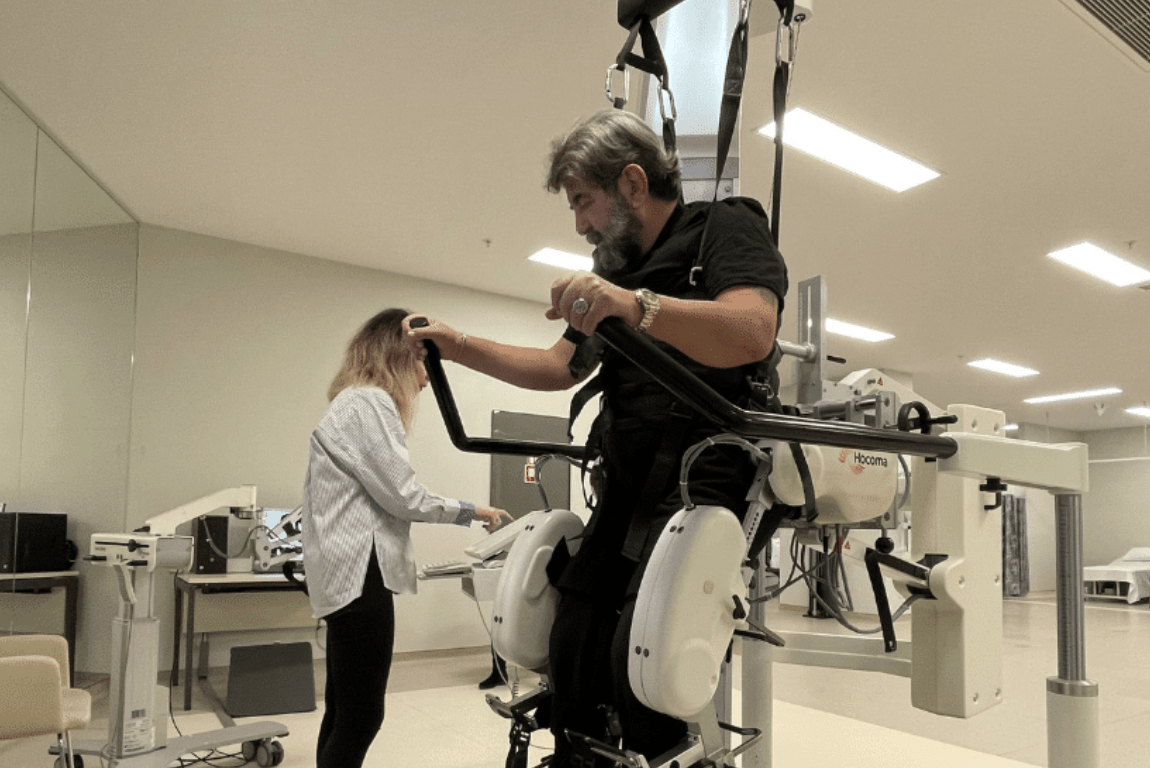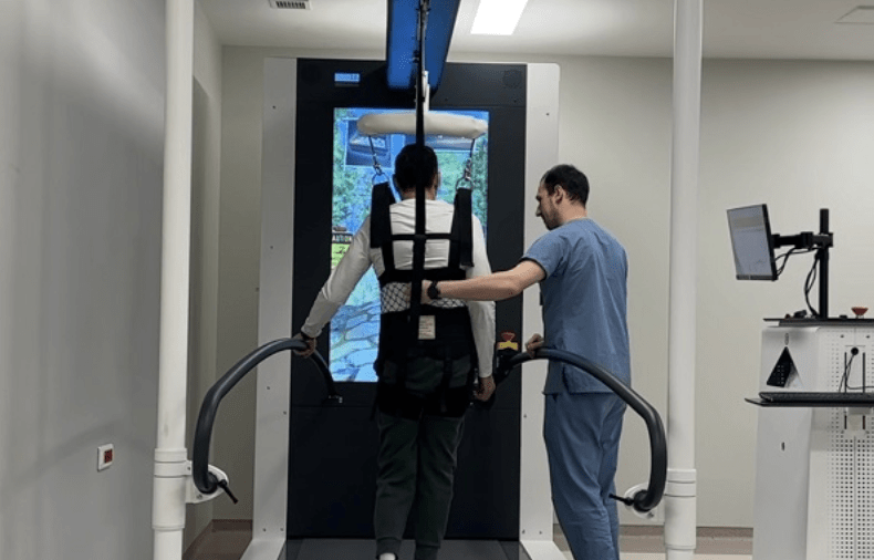 Belçika’dan İstanbul’a düğünü için gelirken yolda başlayan bacak güçsüzlüğü, yürüyememe şikayetleri olan hastada çok nadir görülen omurilik iltihaplanması teşhisi konulmuş. İlaç tedavilerinden sonra hasta günde 4-5 saat süren yoğun kas güçlendirme, robotik fizik tedavi ve sanal gerçeklilik destekli yürüme ve denge eğitimleri ile 1 aylık süreç sonucu tekrar yürümeyi başardı.